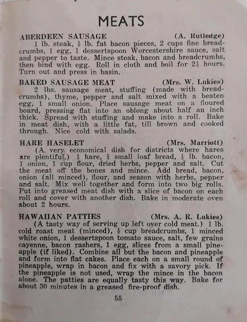 The Murrumbeena Methodist Cookery Book was published by Murrumbeena Methodist Ladies’ League in 1950. Members were invited to submit their recipes to what became a 68-page booklet, containing ‘Over 200 Tested recipes’. It cost 2 shillings.