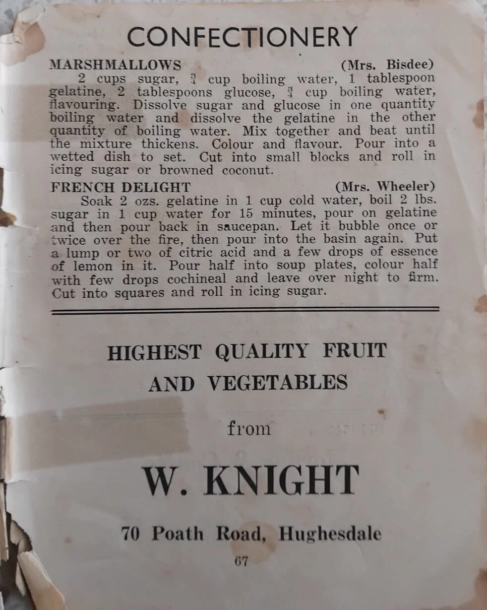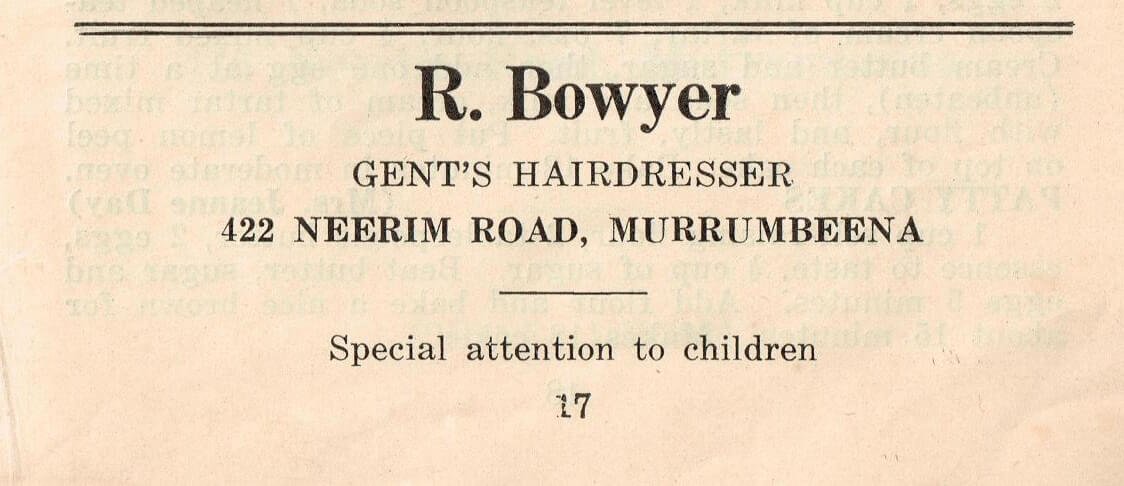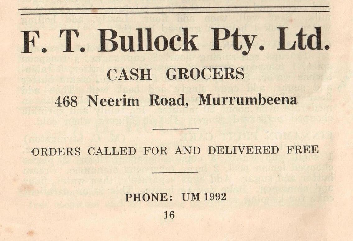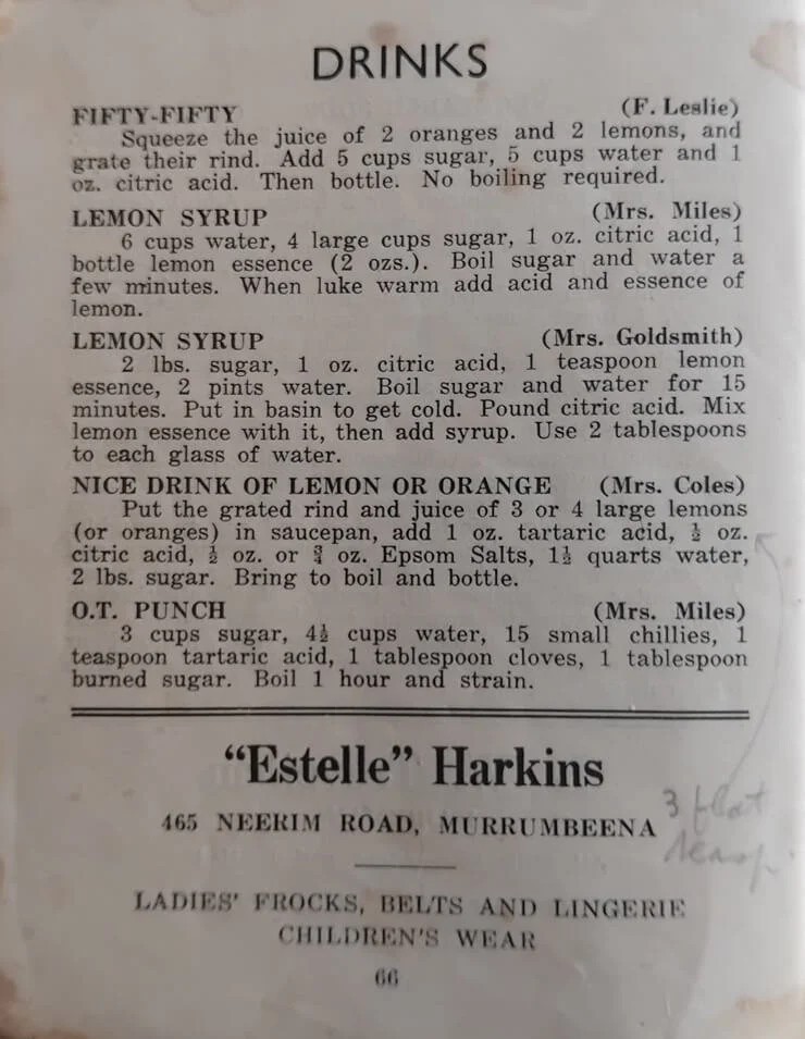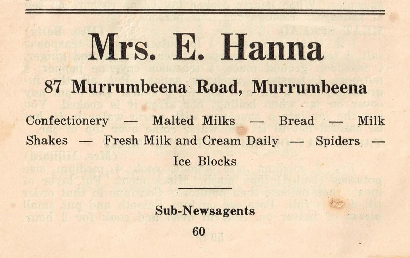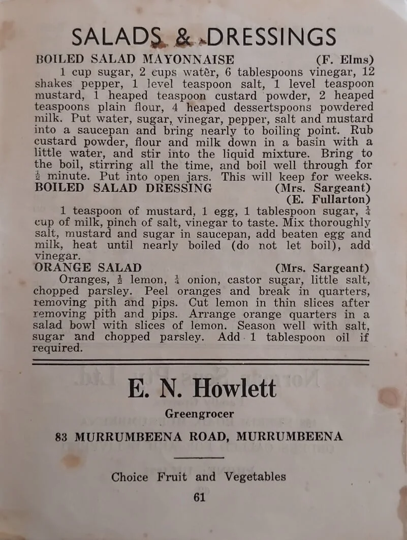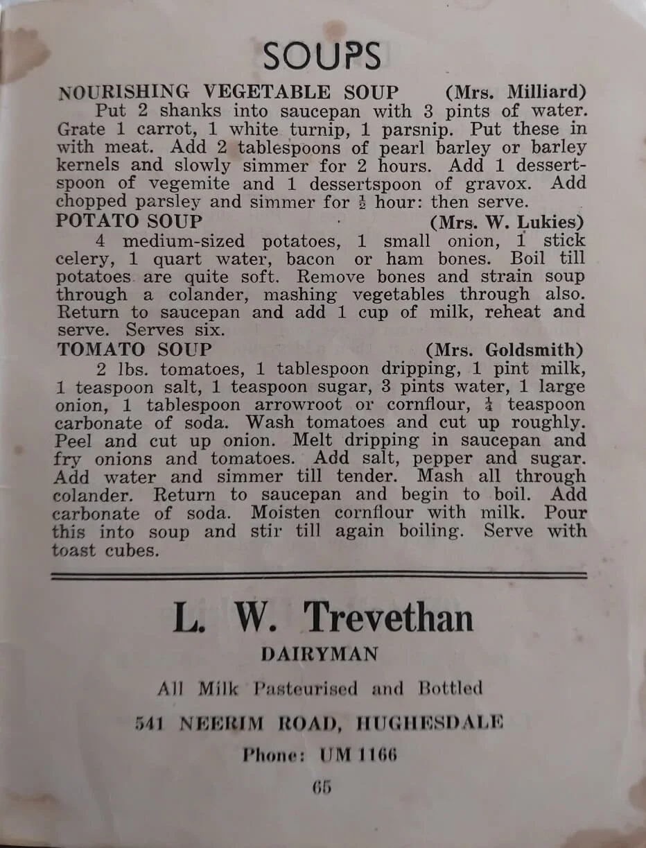 Seventy-five years after its publication, who would have thought that the sponsors’ advertisements would be of as much, if not more interest, than the recipes themselves. They paint a picture of an incredibly vibrant community that, in the small shopping strip based around the intersections of Murrumbeena and Neerim Roads, locals could buy just about everything they required for daily living. In an era with so few owning a car (let alone two) and a distinct lack of large shopping centres, it was women, largely housebound as wives and mothers, (and without the distractions of mobile phones, televisions or the internet), who were the ones who would make their way to Murrumbeena shops. There, they’d meet their friends, catch up on local news and compare notes on their children, before heading home. Is it any wonder that so many older people remember this time in Australia’s history so fondly and as the ‘good old days?’