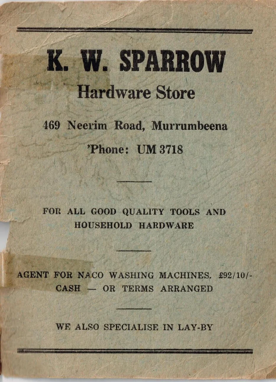 And sitting prominently in Neerim Road, opposite Murrumbeena Station, was Mr. Pigeon and his hardware. Mr Pigeon was an old man who got around in a grey dust-jacket. He was a fine build, and had a wiry frame and a small head. His shop was like those you see in old-time television shows or movies. In an average sized shop, grey and dusty with a timber floor, there were narrow aisles separated by tall shelves. On them were boxes, jars, tins and packets containing an assortment of hinges, nails, screws and the like, all available, it seemed as individual items and all dusty. I seem to remember Oakleigh having a hardware just like it. I suppose they were common in the day and Murrumbeena’s must have been one of the last. It must have been gone by the end of the 1980s. I think the very last one is in Albert Park and it’s the real deal. So Bunnings, watch out.