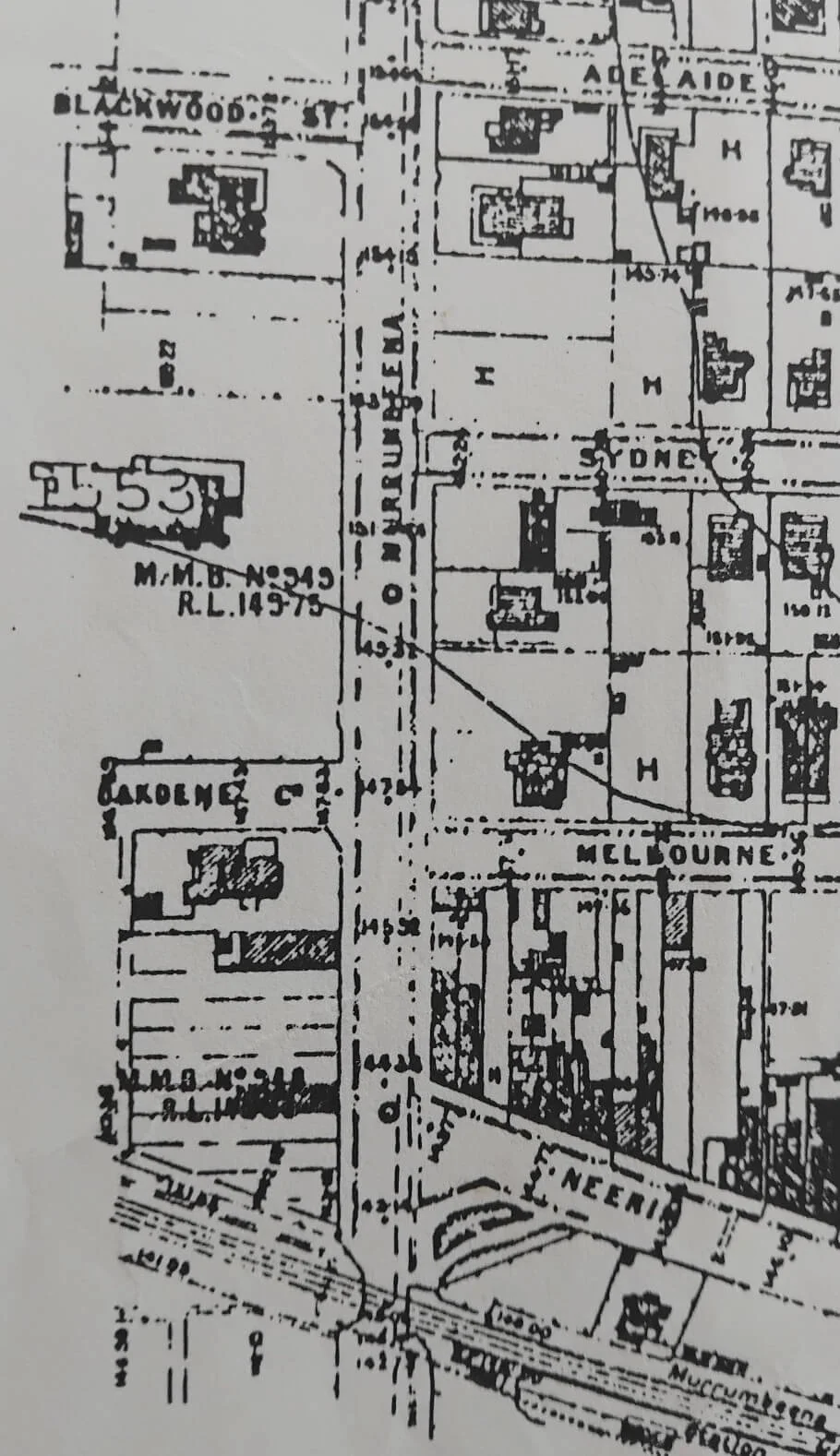 Oakedene on a Melbourne and Metropolitan Board of Works (MMBW) map from 1937. Oakdene is the large property (‘53’) on the west side of Murrumbeena Road.