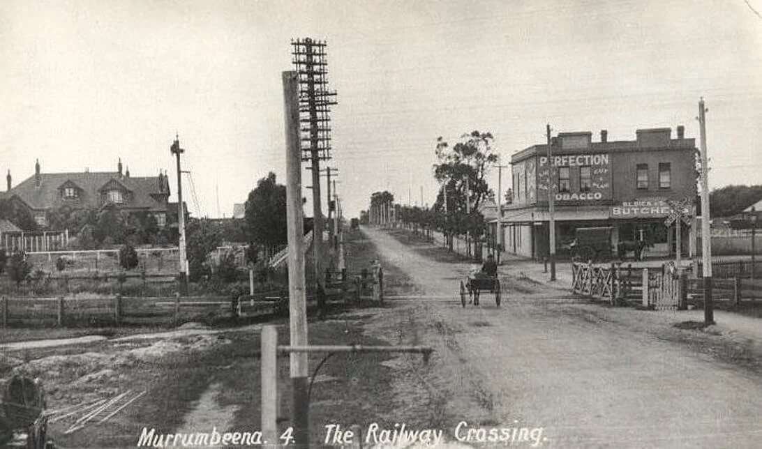 I knew the building was Oakdene because its name had occasionally come up in the Murrumbeena history I was collecting. I also knew it because it appeared in an old photograph of Murrumbeena taken around 1900. That photograph was taken looking north along Murrumbeena Road from a vantage point just south of the railway crossing there. A horse and cart are crossing the line and turning into Neerim Road. I had seen the photo before, but didn’t have a copy of it. I received one from long-time and much missed Murrumbeena identity and newsagent proprietor, John Attwood. It’s one of the rare early photographs of Murrumbeena and a rarer one still as it includes Oakdene.